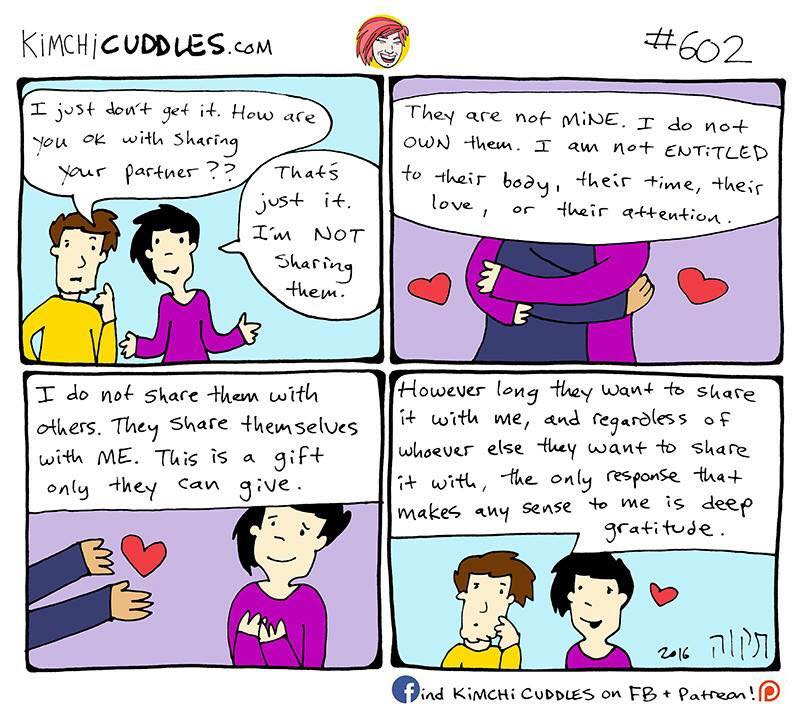 My view on relationships is that nobody is mine to “own”, I want to always be open and honest, and I want you to have the freedom to find the things you need in me, and anyone else. I don’t see this as “sharing you with others.” I will always be thankful that you shared any part of yourself with me. The only response I can give to that is deep gratitude.